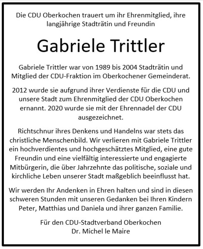 Nachruf des CDU Stadtverbandes zum Tod von Gabriele Trittler
